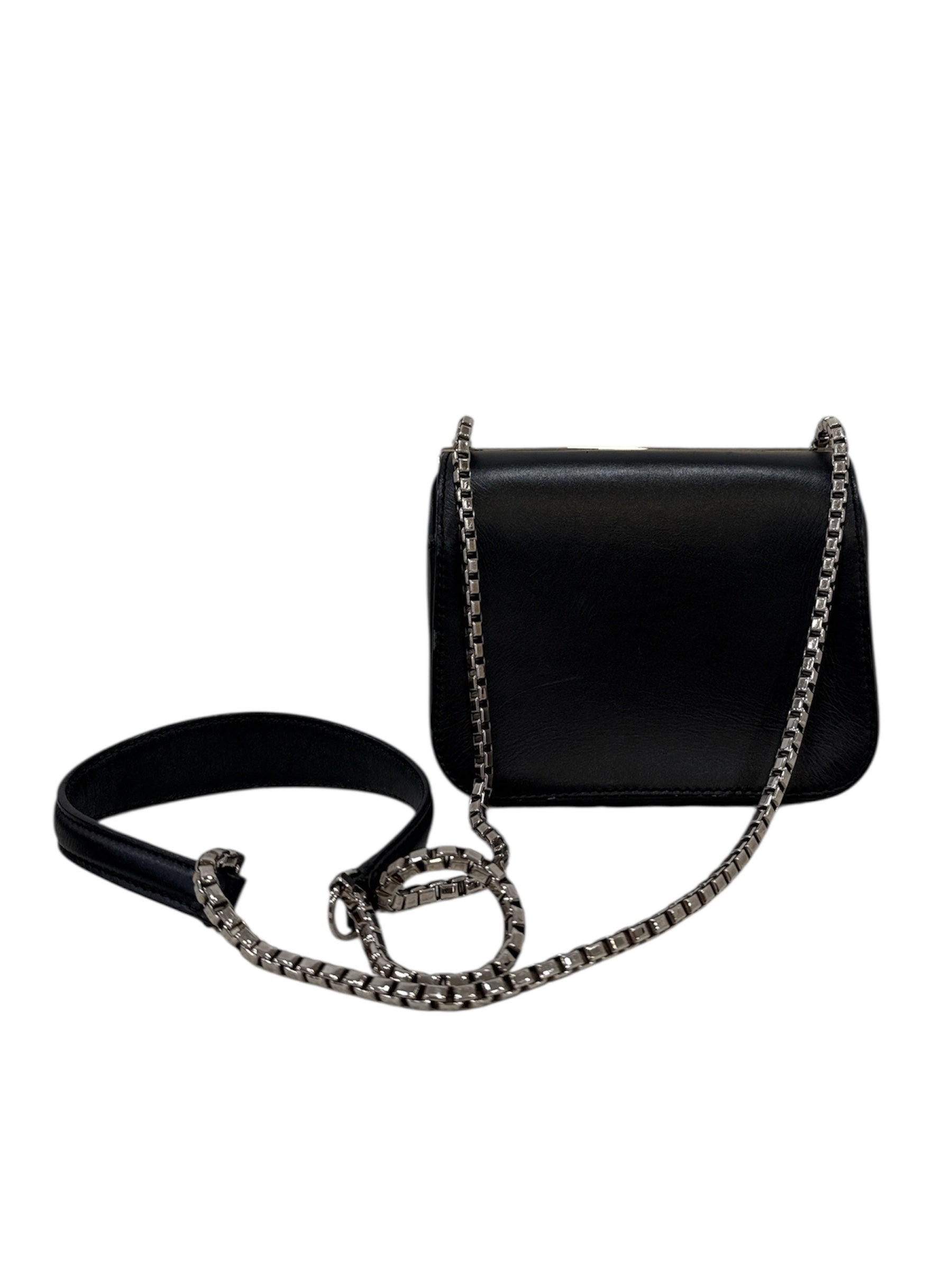 Black with silver detailing. Magnet front closure and one open pocket inside. Hardware shows some scratches.