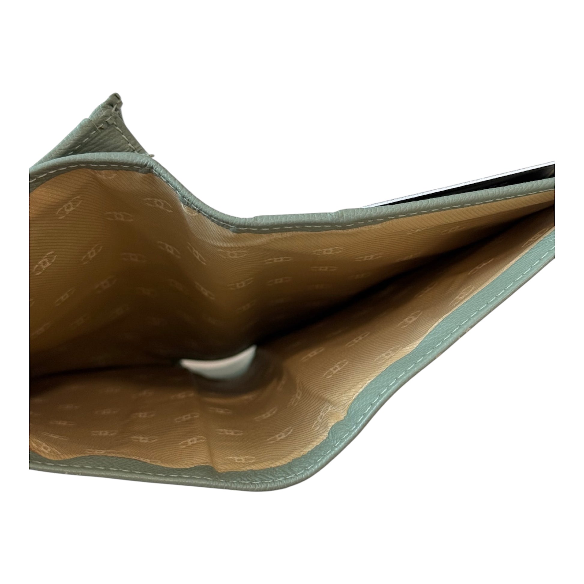 Chanel fold over long wallet. Card slots on left side and zipper closure on the right side along with other slot compartments. On top you have a deep long pocket to place bills and or other documents. Wallet comes with off brand gold chain to make it more of a wallet on a chain. Leather is in great condition and doesn’t show tears or holes.
