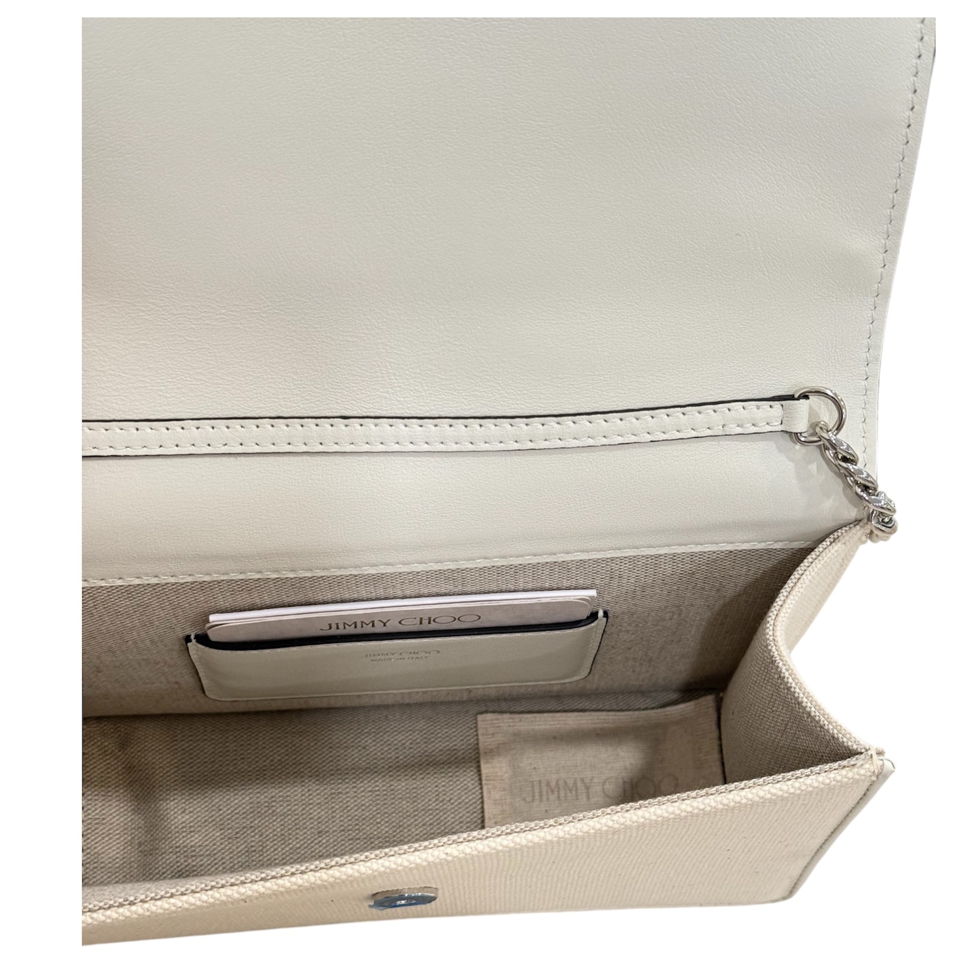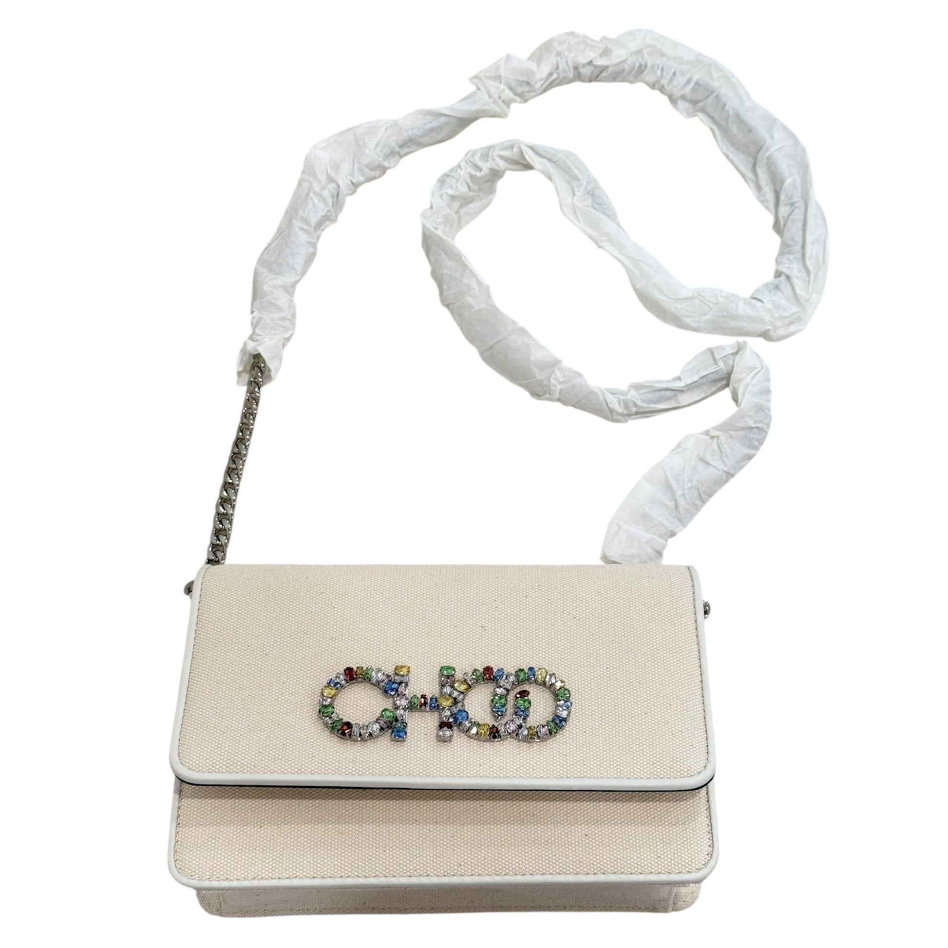 Jimmy Choo Kalina crystal handbag. Silver crossbody chain is still wrapped in original plastic from store. New in box!