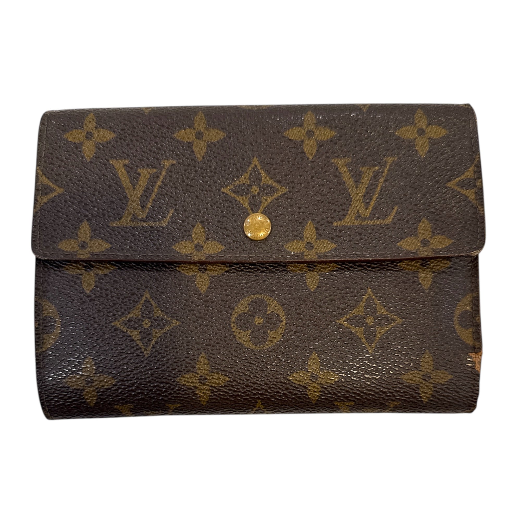 Louis Vuitton monogram wallet. Corners and inside show wear. 6 card slots inside and a middle pouch with a button closure as well as top insert.